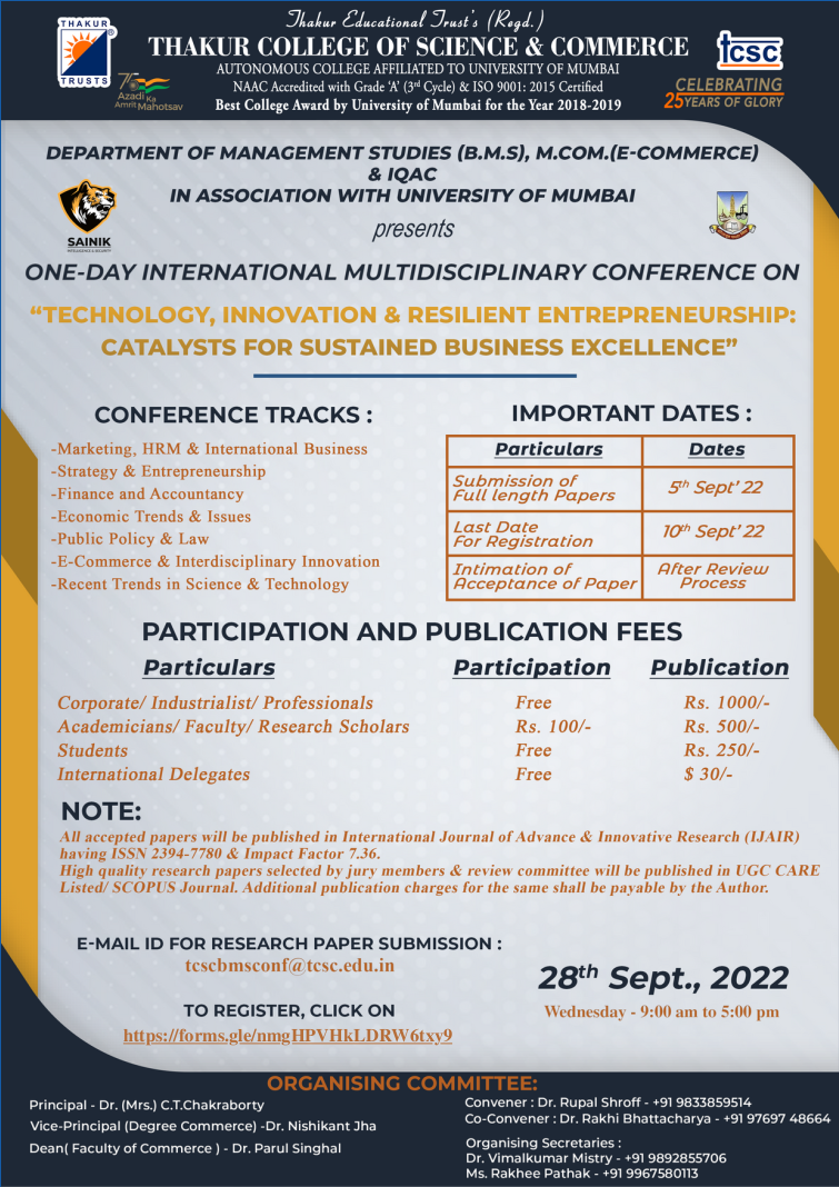 It gives us immense pleasure to share with you that Thakur College of Science & Commerce, Department of Management Studies and M.Com.(E-Commerce) is organising a multi-disciplinary conference on “Technology, Innovation and Resilient Entrepreneurship – Catalyst for sustained Business Excellence” on 28 September, 2022.