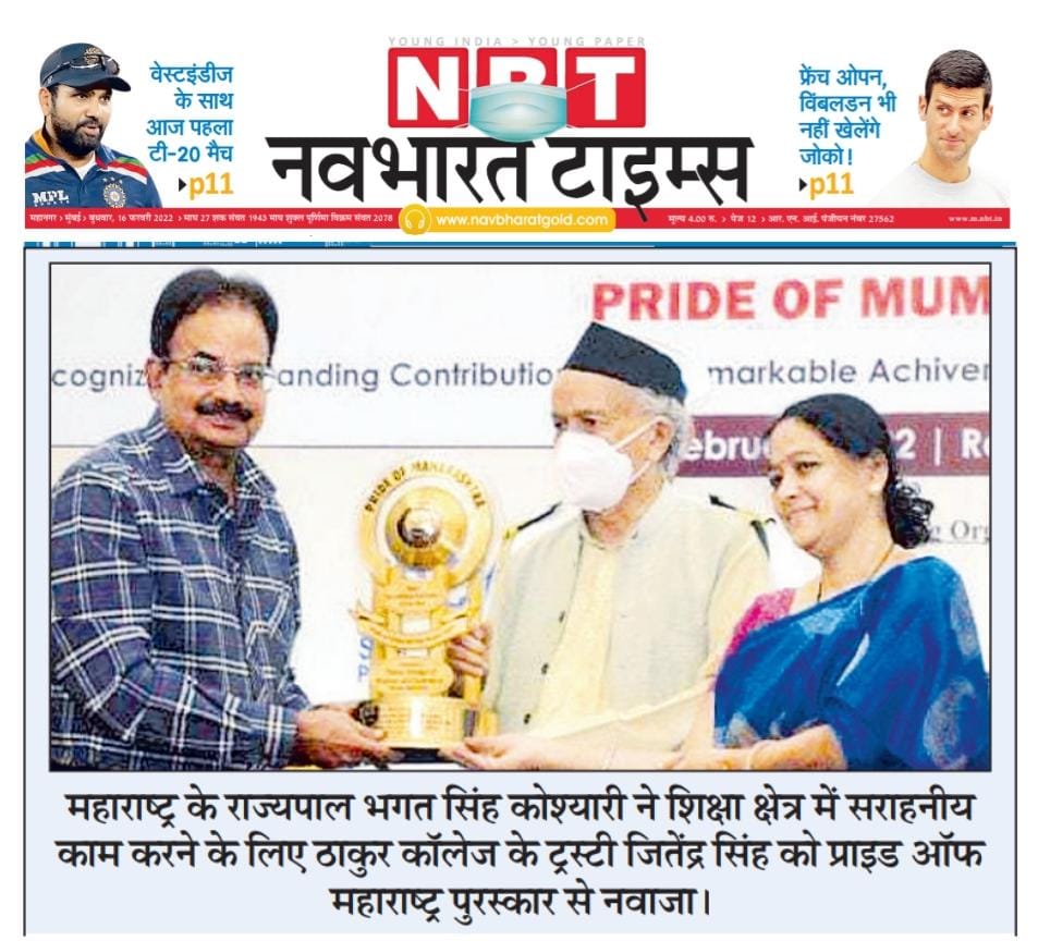 Maharashtra Industrial & Economic Development Association has presented 12th Edition of “PRIDE OF MAHARASHTRA AWARDS 2021” to Thakur College of Science and Commerce as a Best Educational Institution of the Year Award. The Award received by Mr. Jitendra Singh – In–Charge Trustee of Thakur College of Science and Commerce and presented by Hon’ble Governor of Maharashtra, Shri Bhagat Singh Koshyari on 13th February 2022 at the Raj Bhavan, Mumbai.