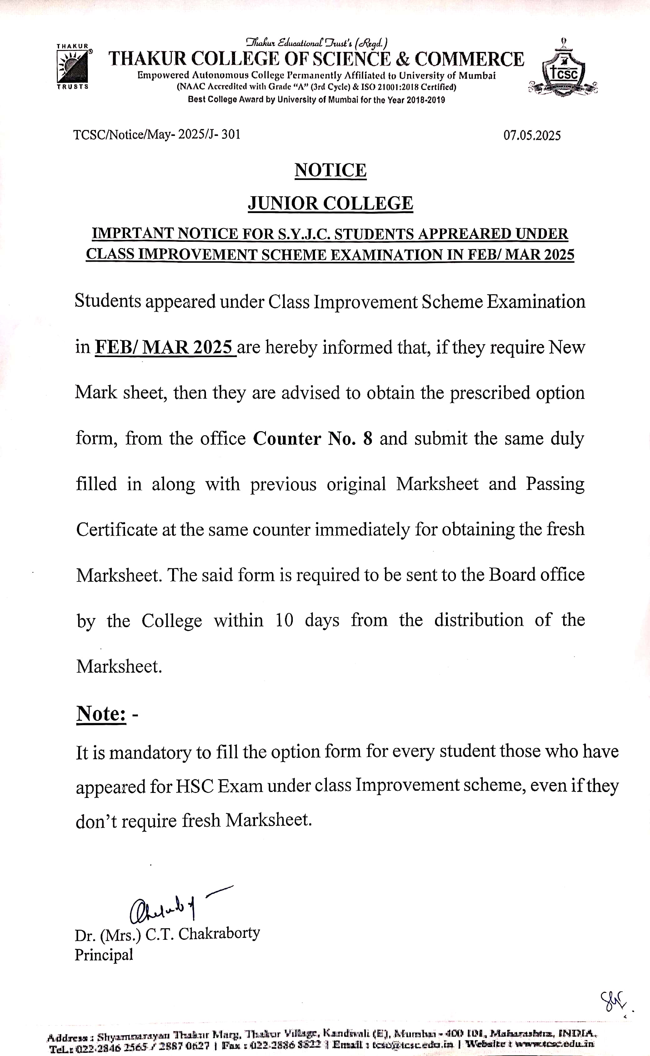 Important notice for SYJC students appeared under class improvement scheme exam in Feb or Mar 2025