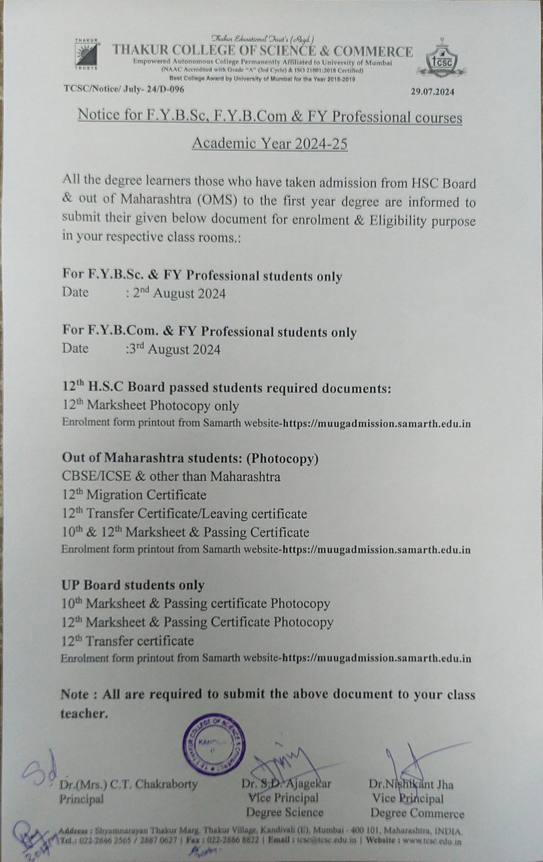 NOTICE FOR F.Y.B.SC., B.COM AND PROFESSIONAL PROGRAM 24- 25