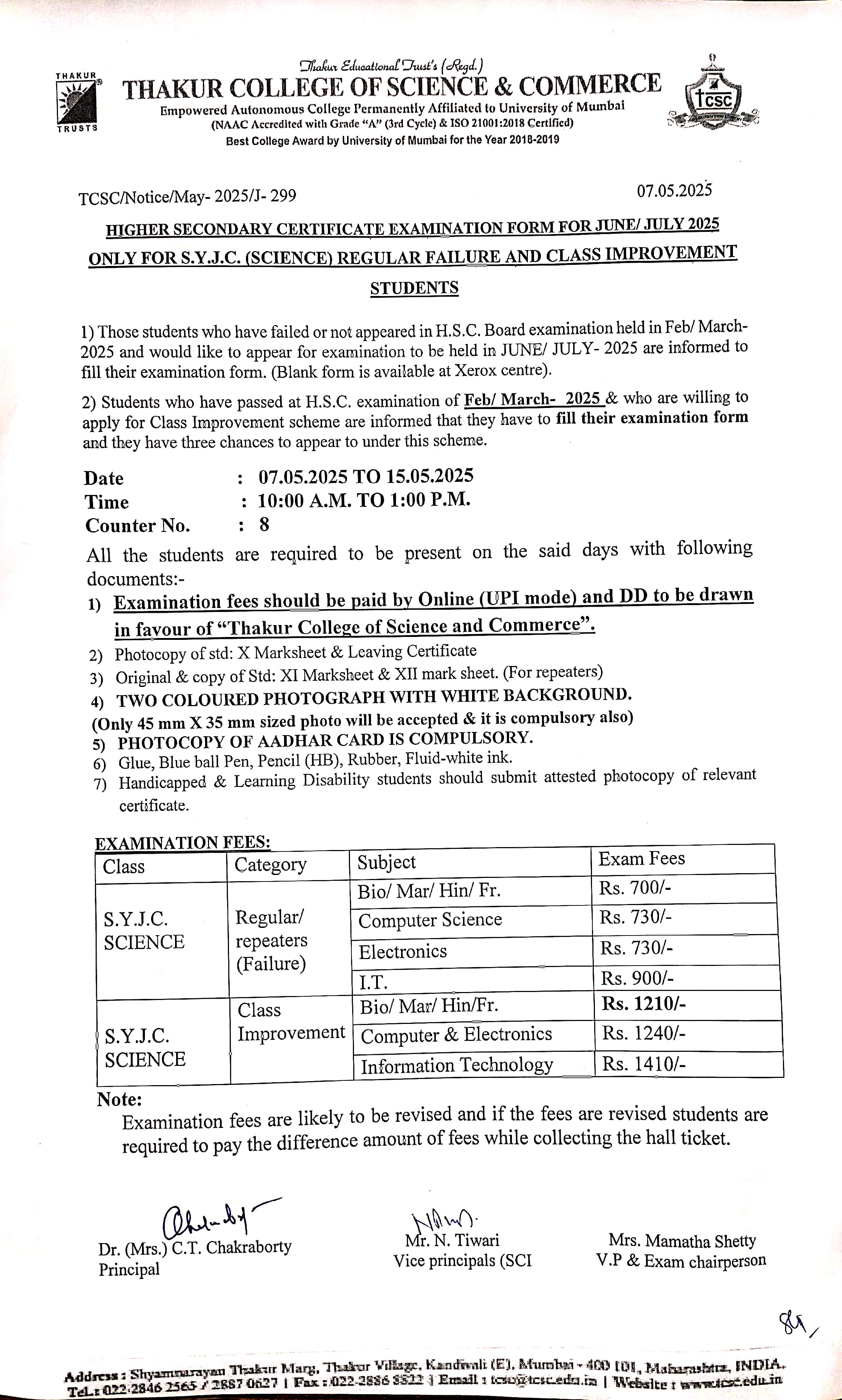 Notice for Repeater & Class Improvement Form Filling of SYJC Science & Commerce 2025- 26