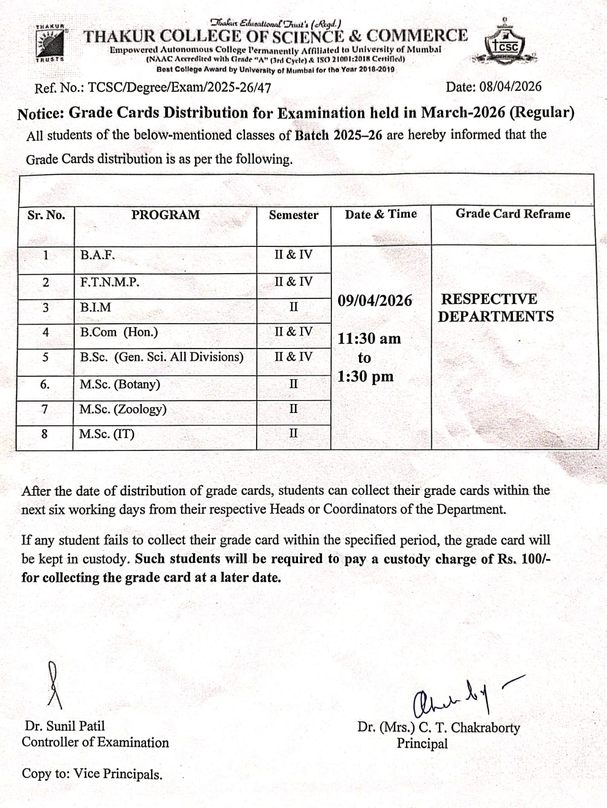 Grade Card Distribution Regular March 2026
